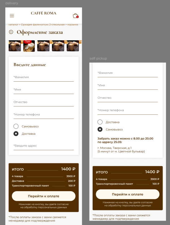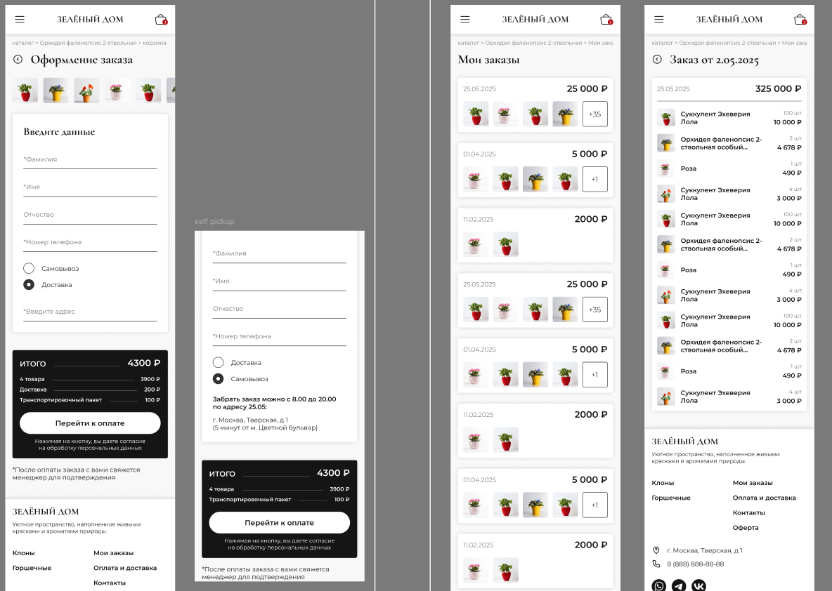 - Страницы каталога, заказов, информации, корзины, оплаты